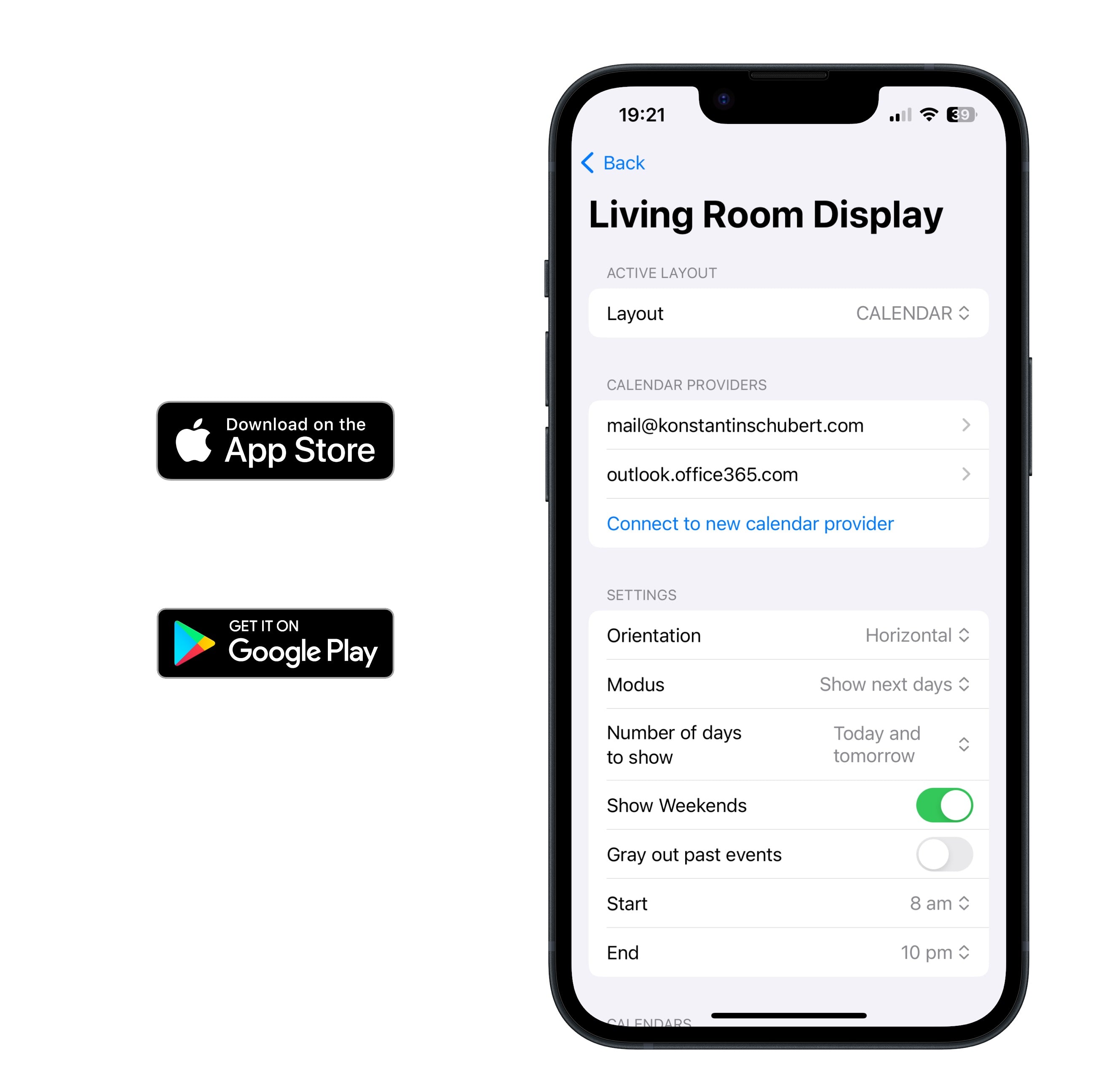 It can display calendars from Google Calendar and any iCalendar/WebCal (ICS) link. Outlook is supported via published ICS calendars.