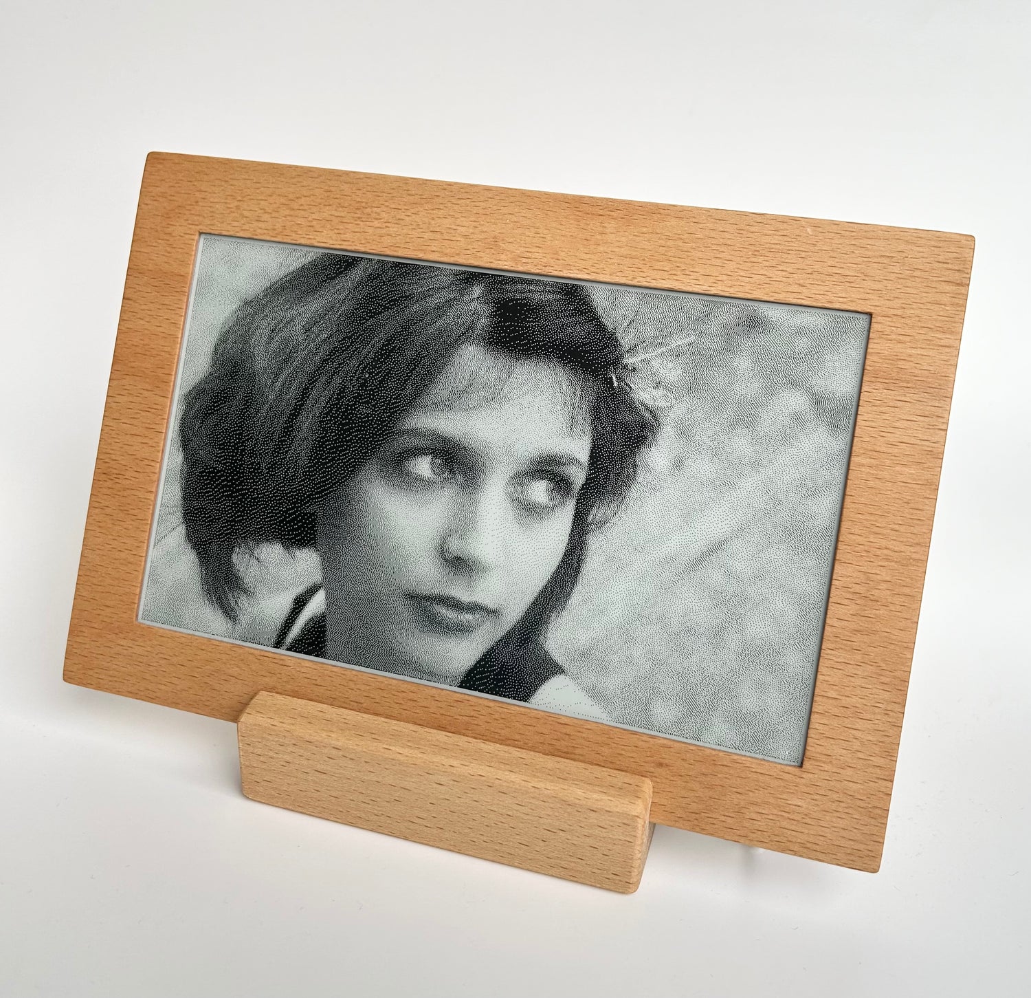 Upload your photos and display them in black-and-white elegance. Because the e-paper display doesn't emit light, this special digital photo frame will blend in with your room. It looks less like a screen and more like a low-res, black-and-white print.