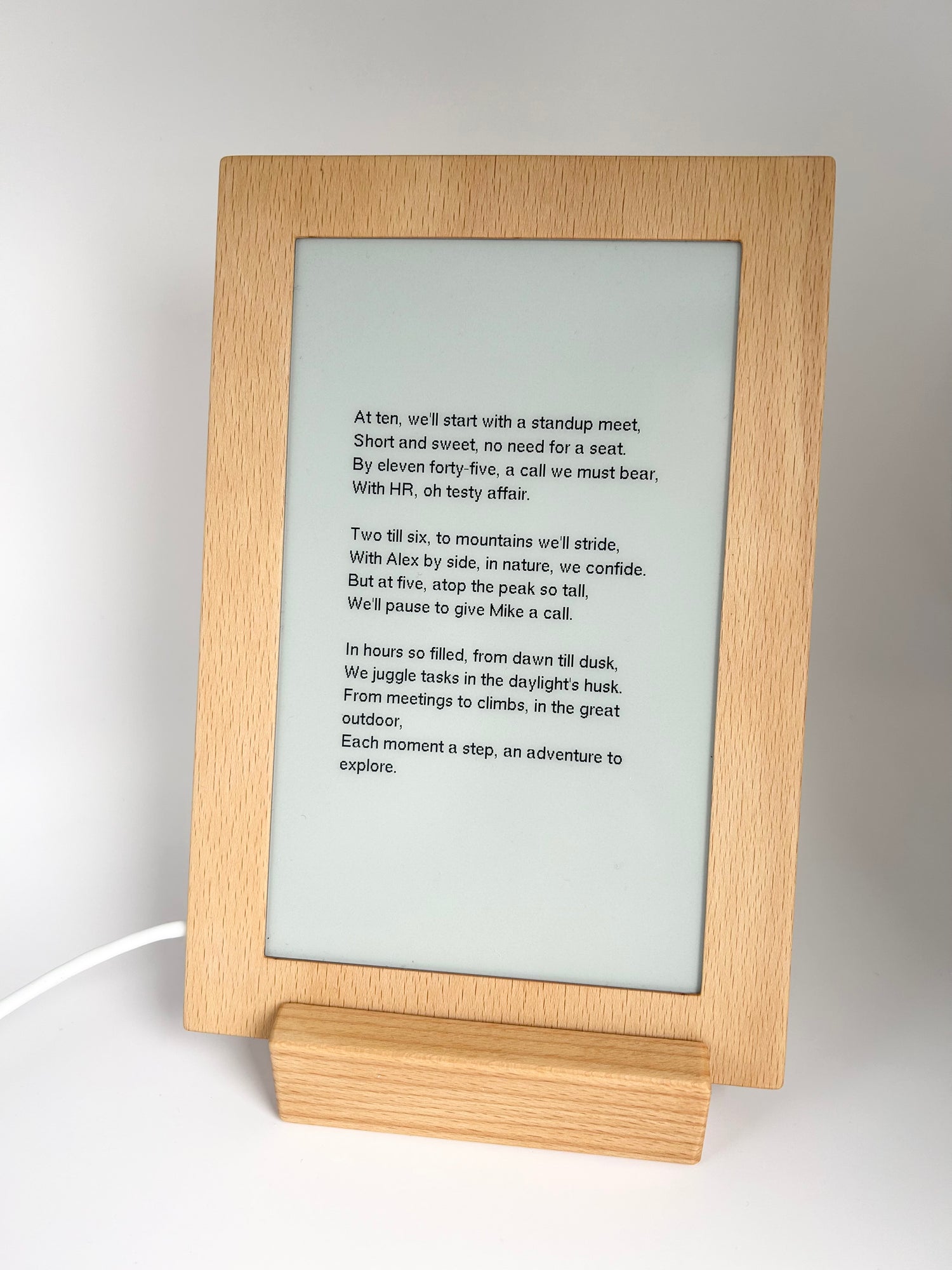 With this app for the Invisible Smart Display, the events of the day are summarised as a poem (or as normal text, if you prefer). You can sync events from Google Calendar or any iCalendar source.